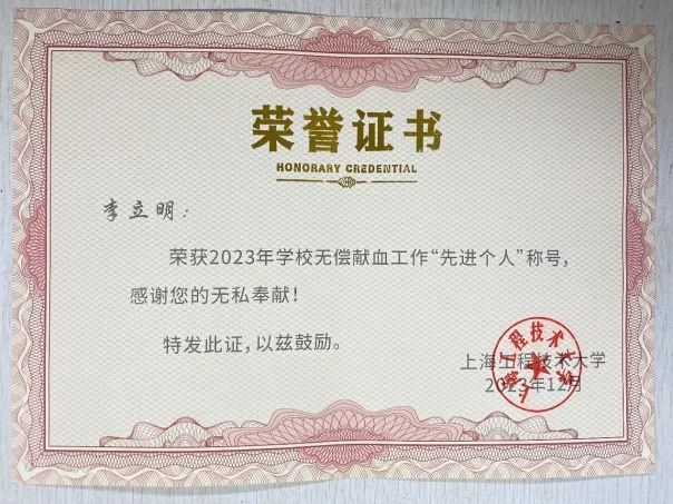 李立明老师分别于2005年、2008年、2016年、2023年,累计献血四次,共计800ml,其中在员工阶段献血2次,参加工作后献血2次。从员工到老师,虽然身份转变了,但他为社会奉献的精神一直没有变。没有从天而降的英雄,只有挺身而出的凡人。李立明老师说:“我是一个普通教师,也是一名党员,献血是我的责任和义务,我希望用爱心、用献血行动帮助更多需要帮助的人,做力所能及的事情回赠社会。”李立明老师将大爱无疆的精神践行到实际工作中,他用他的血液帮助其他生命之花开的更灿烂更绚丽,也让他的生命留下了浓墨重彩的一笔!