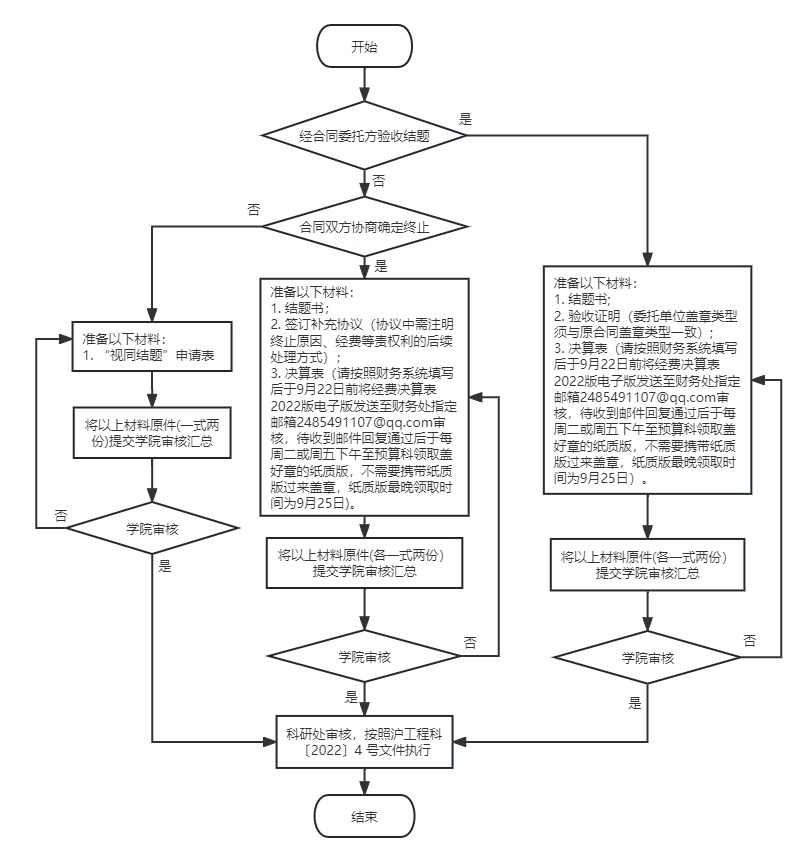 各相关项目负责人应在受理期间提交项目结题、项目终止或“视同结题”申请,相关结题材料(2022版请至“服务门户-科研业务申请-横向科研项目结题”业务中下载)请提交科研秘书,公司审核汇总后于2024年9月27日16:00前提交科研处。逾期未办理的结余经费将予以冻结。具体流程详见业务流程图(附图1)。