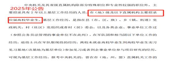 2025年国考公告中表明:市(地)级及以下直属机构招录对象仍然是应届高校毕业生,去年也有五成的岗位是针对应届毕业生,在近两年毕业生人数不断增加的情况下,这表明在国家公务员招录中非常重视应届毕业生人群,为高校毕业生提供更多机会,也切实解决就业问题,毕业就进入公务员体系是很不错的选择。