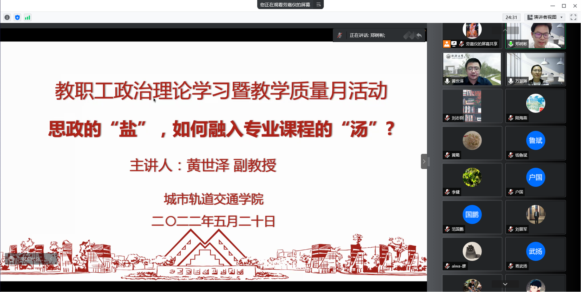 为深入贯彻落实习近平总书记关于加强思想政治理论课建设的重要指示精神,以习近平新时代中国特色社会主义思想铸魂育人,构建“大思政”育人格局,形成各类课程同思政课教学同向同行的协同效应,不断提高新时代育人质量和办学水平。5月20日晚上,3044永利集团邀请同济大学优秀党员、同济大学名课优师、交通运输工程公司教学中心副主任黄世泽副教授作《思政的“盐”,如何融入专科课程的“汤”?》的专题辅导报告。全体教师100余人“云端”聚首,共同聚焦课程思政建设。本次报告由公司副经理郑树彬主持