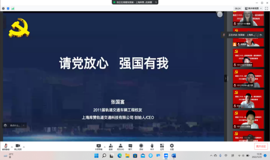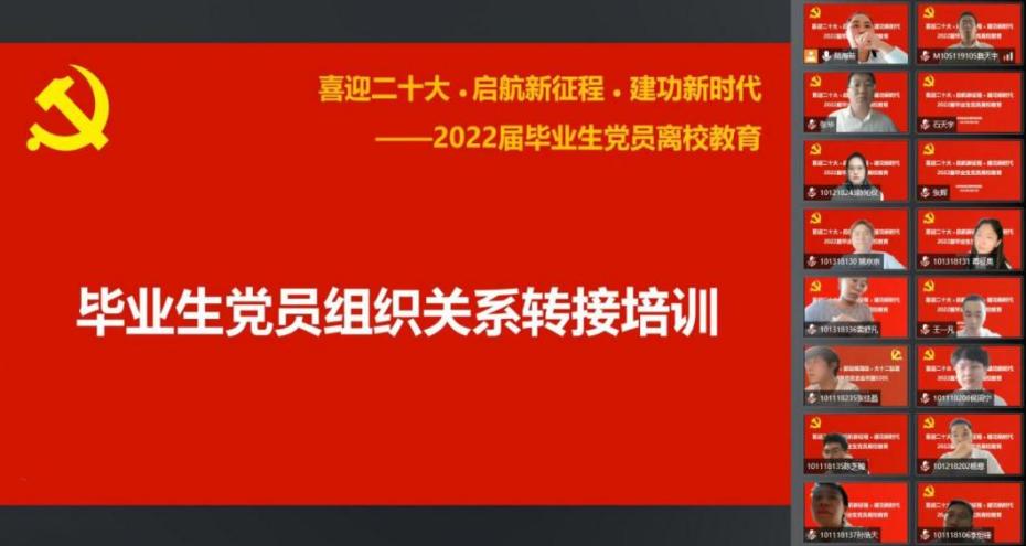 5月25日下午,公司党委“喜迎二十大·启航新征程·建功新时代”2022届毕业生党员离校教育活动在线上顺利举办。公司特邀党建组织员董义明,公司党委书记万慧琳,党委副书记盛知恒,公司2011届优秀党员员工代表、上海库赞轨道交通科技有限公司首席执行官张国富出席本次会议。参加会议的还有公司党委组织员,全体党支部书记,2022届全体毕业生党员以及各员工党支部发展对象、积极分子等员工代表。本次会议由公司党委副书记盛知恒主持。