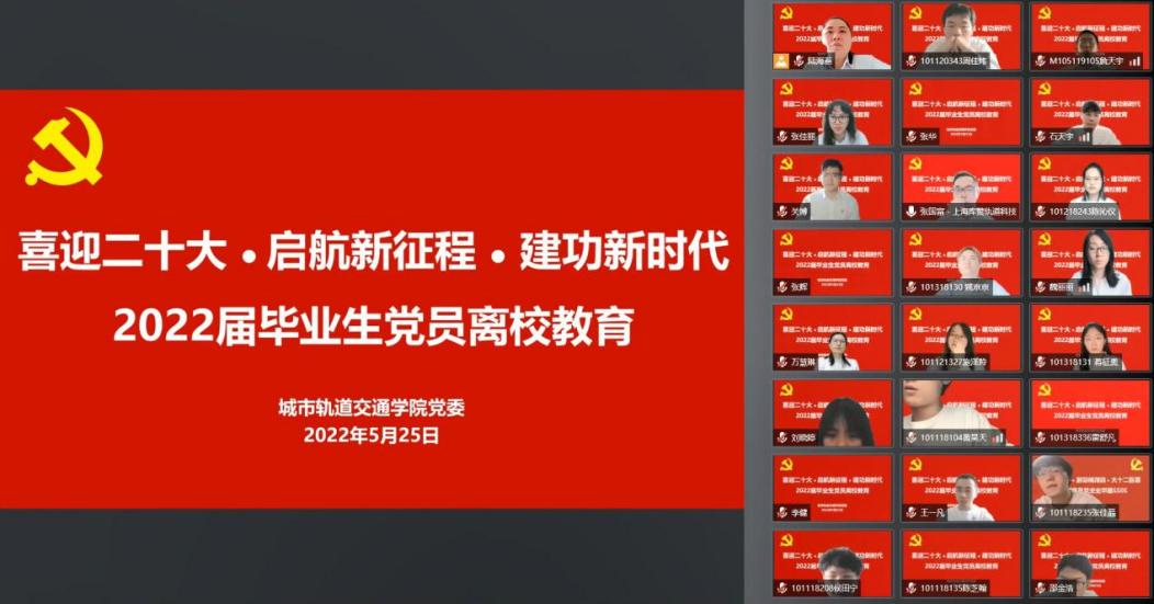 5月25日下午,公司党委“喜迎二十大·启航新征程·建功新时代”2022届毕业生党员离校教育活动在线上顺利举办。公司特邀党建组织员董义明,公司党委书记万慧琳,党委副书记盛知恒,公司2011届优秀党员员工代表、上海库赞轨道交通科技有限公司首席执行官张国富出席本次会议。参加会议的还有公司党委组织员,全体党支部书记,2022届全体毕业生党员以及各员工党支部发展对象、积极分子等员工代表。本次会议由公司党委副书记盛知恒主持。