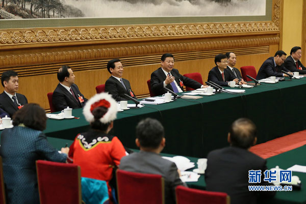 3月7日,中共中央总书记、国家主席、中央军委主席习近平参加十二届全国人大四次会议黑龙江代表团的审议。 新华社记者 兰红光 摄