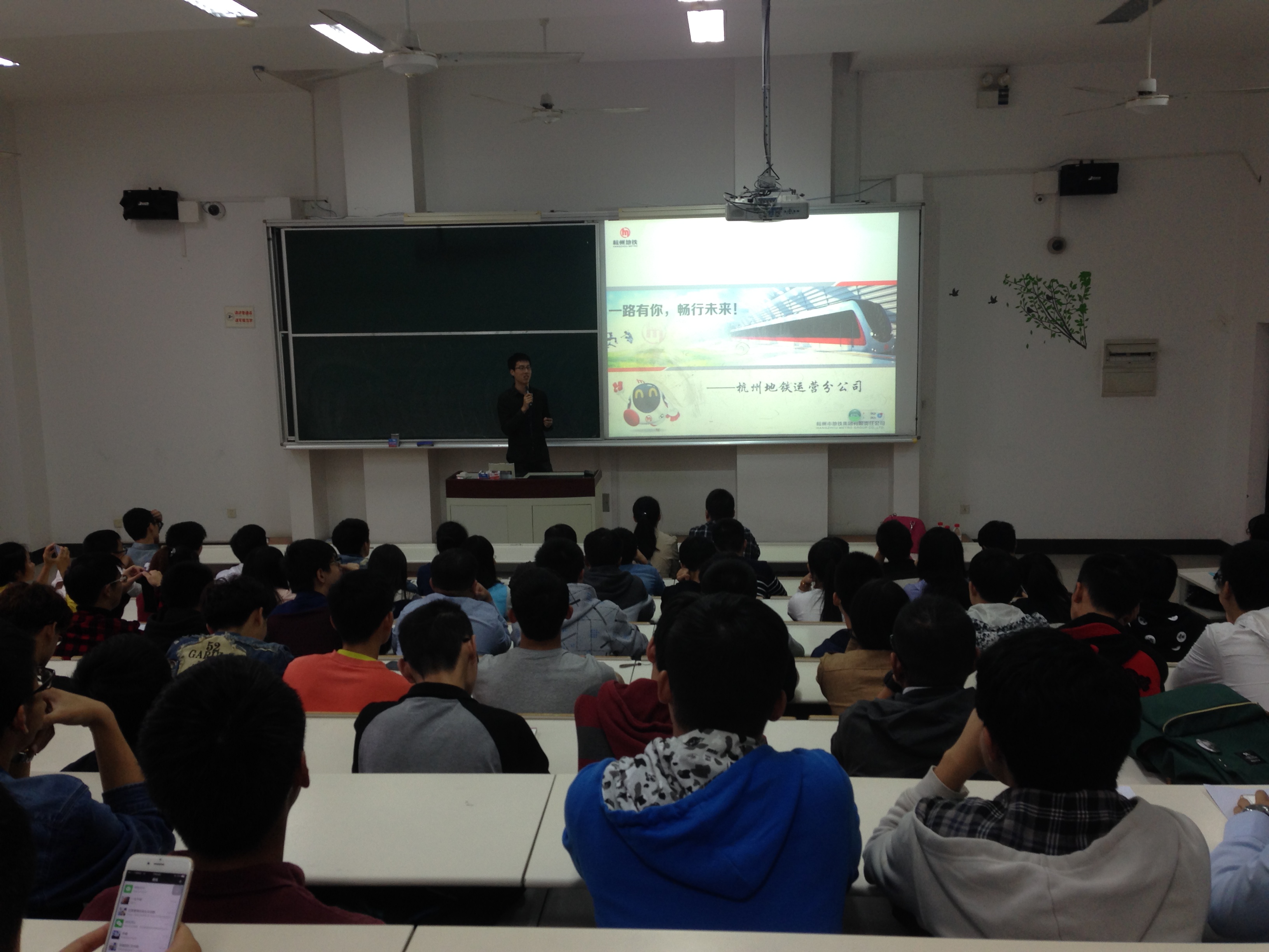 10月14日杭州市地铁集团有限责任公司运营分公司人事专员来校针对大一、大二、大三年级的在校员工进行了就业宣讲。公司党总支副书记万慧琳老师、就业辅导员王瑞芳老师参加了宣讲会。本次宣讲由杭州地铁运营分公司人力资源部的谢老师主讲,他对杭州地铁的目前建设现状、未来发展规划、企业文化建设、员工薪酬待遇等都做了详细的介绍,随后播放了杭州地铁与杭州电视台联合拍摄的企业宣传片,视频中详细的展示了各个工作岗位的具体情况及员工工作和生活情况。在最后的互动环节,同学们积极提问,老师详细解答,让在场的同学们对地铁行业有了更直观的认识,现场气氛十分热烈。