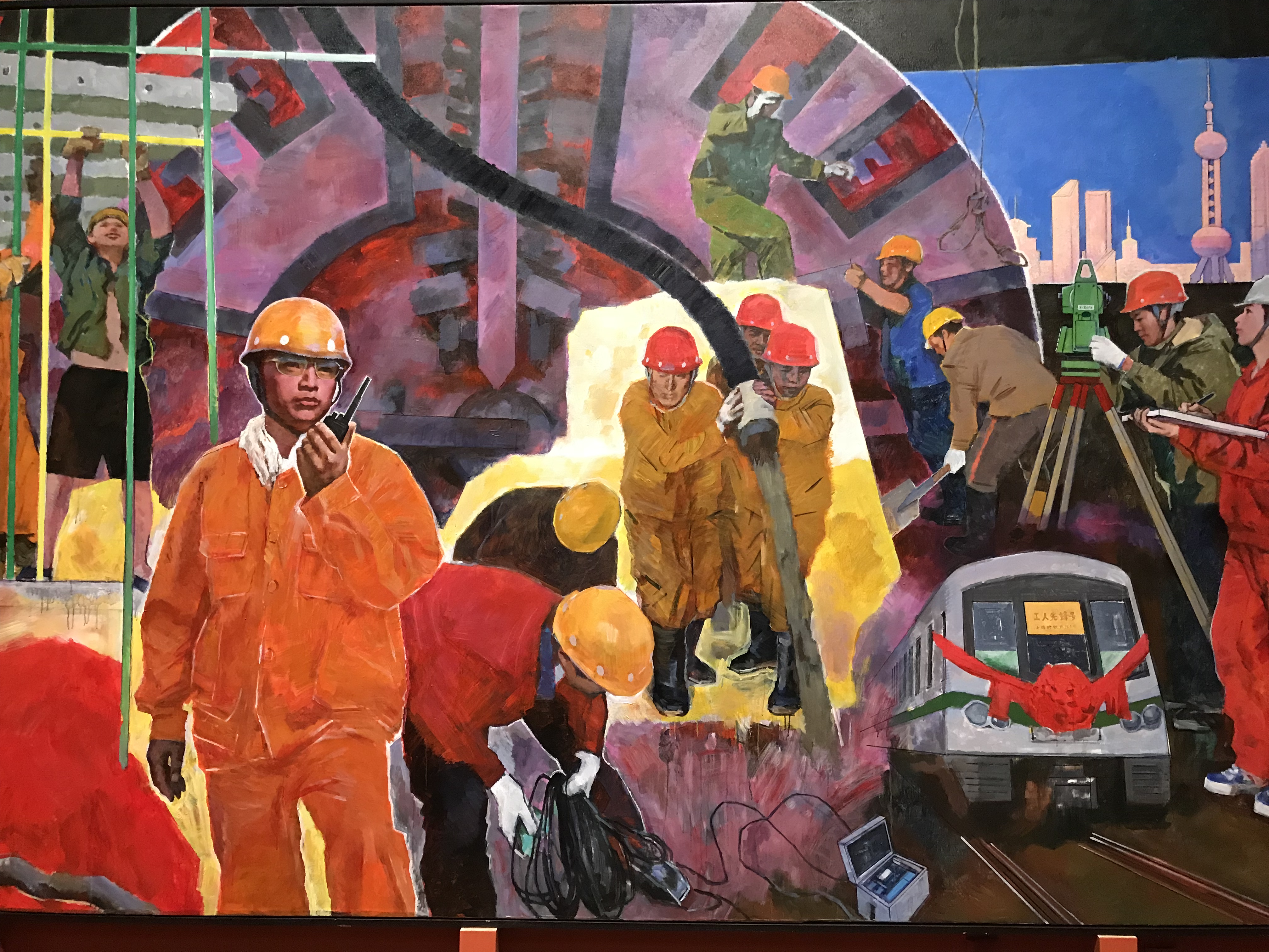 在参观过程中,各位党员或驻足细读或拍照留念,一边惊叹文艺工作者精湛的工艺技术,一边感受中国共产党发展历程的悲壮与雄伟。在油画《都市脊梁——上海轨道交通建设者》前,党员们纷纷为自己身为轨道学子而深感自豪、倍加珍惜。展厅中大型互动装置《天路》引得不少观众驻足,96辆彩色共享单车悬挂在展厅里,宛如一道彩虹横贯空中。巨幅油画《牵挂》也吸引了很多人的目光,这幅画表现的是习近平总书记到上海杨浦社区探望群众和孩子时,上海阿婆为习近平总书记“点赞”的场景,暖暖的色调感染着在场的每一个人。