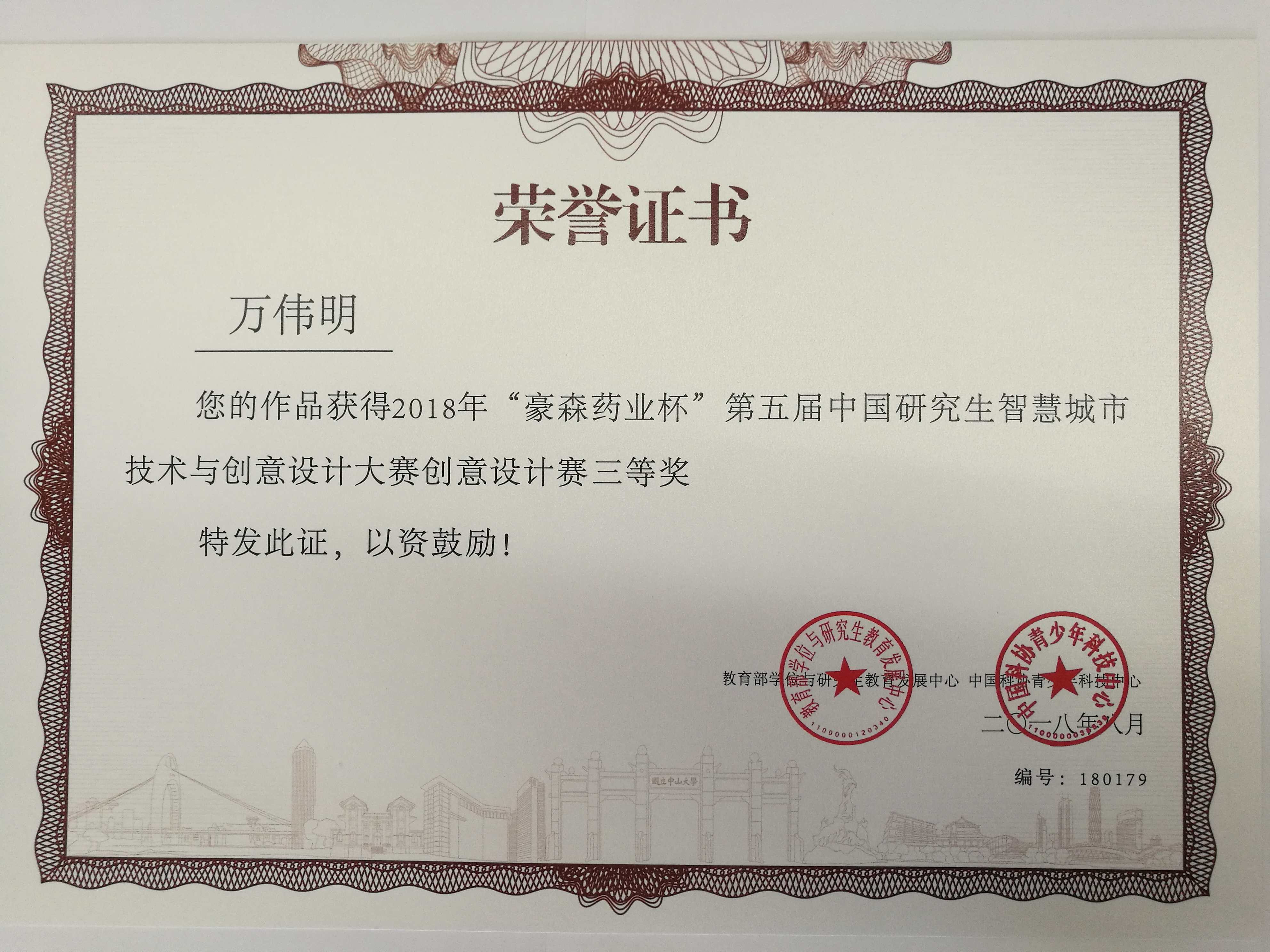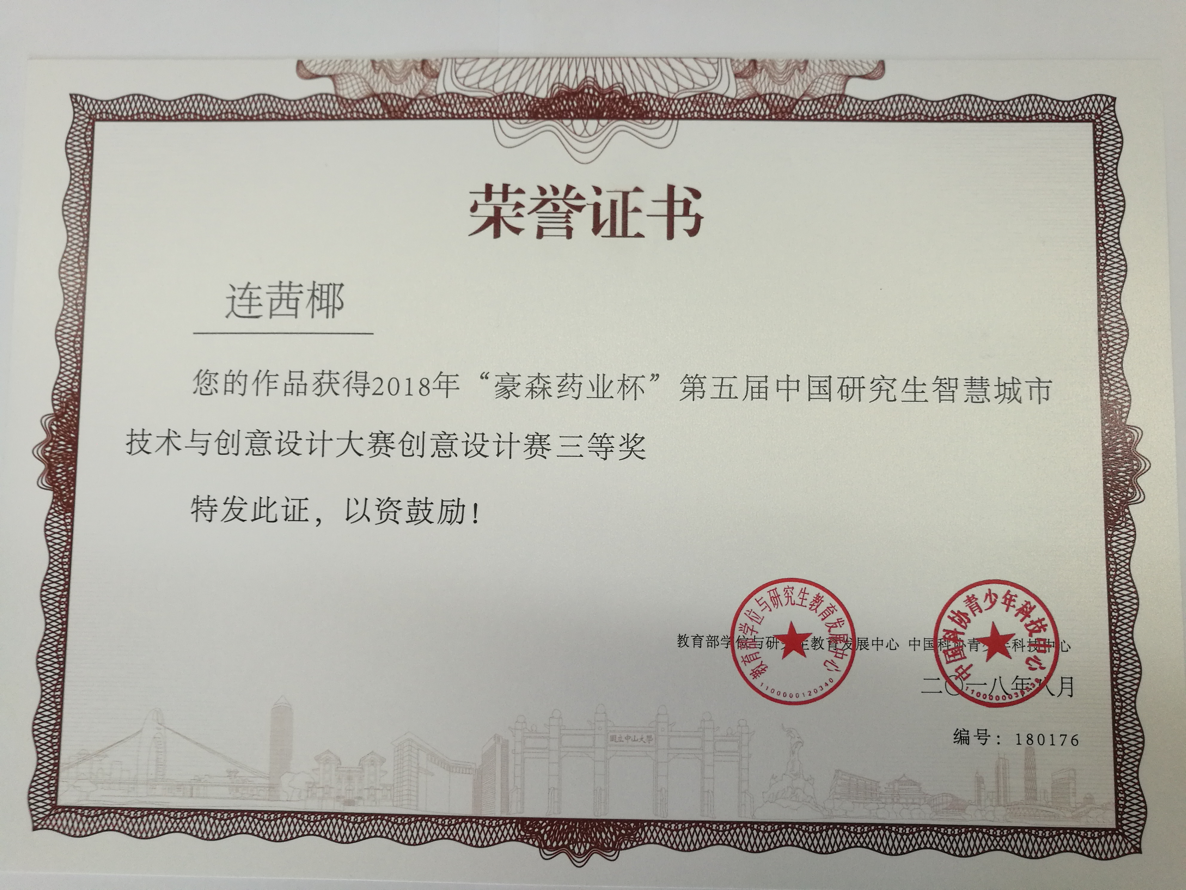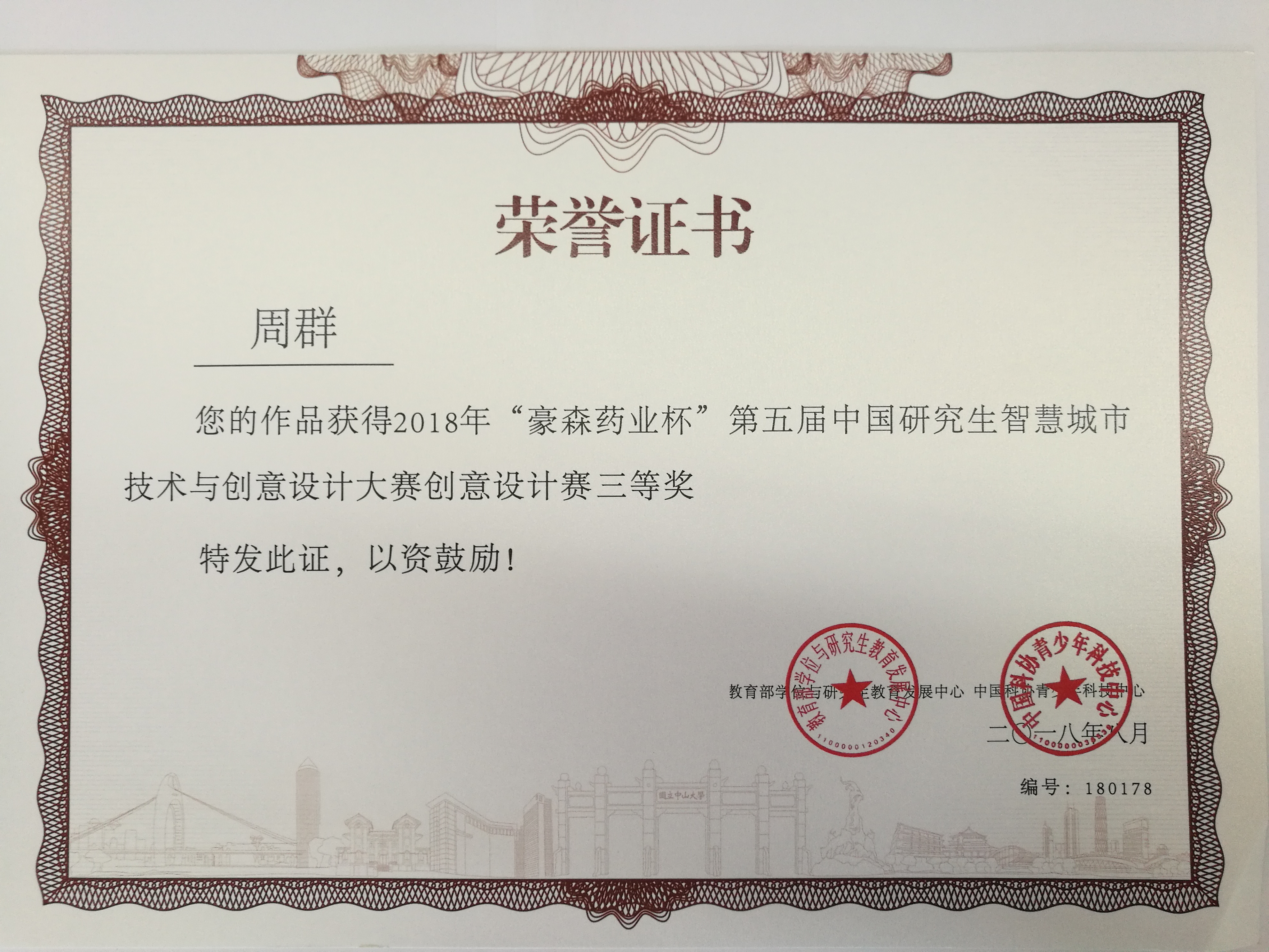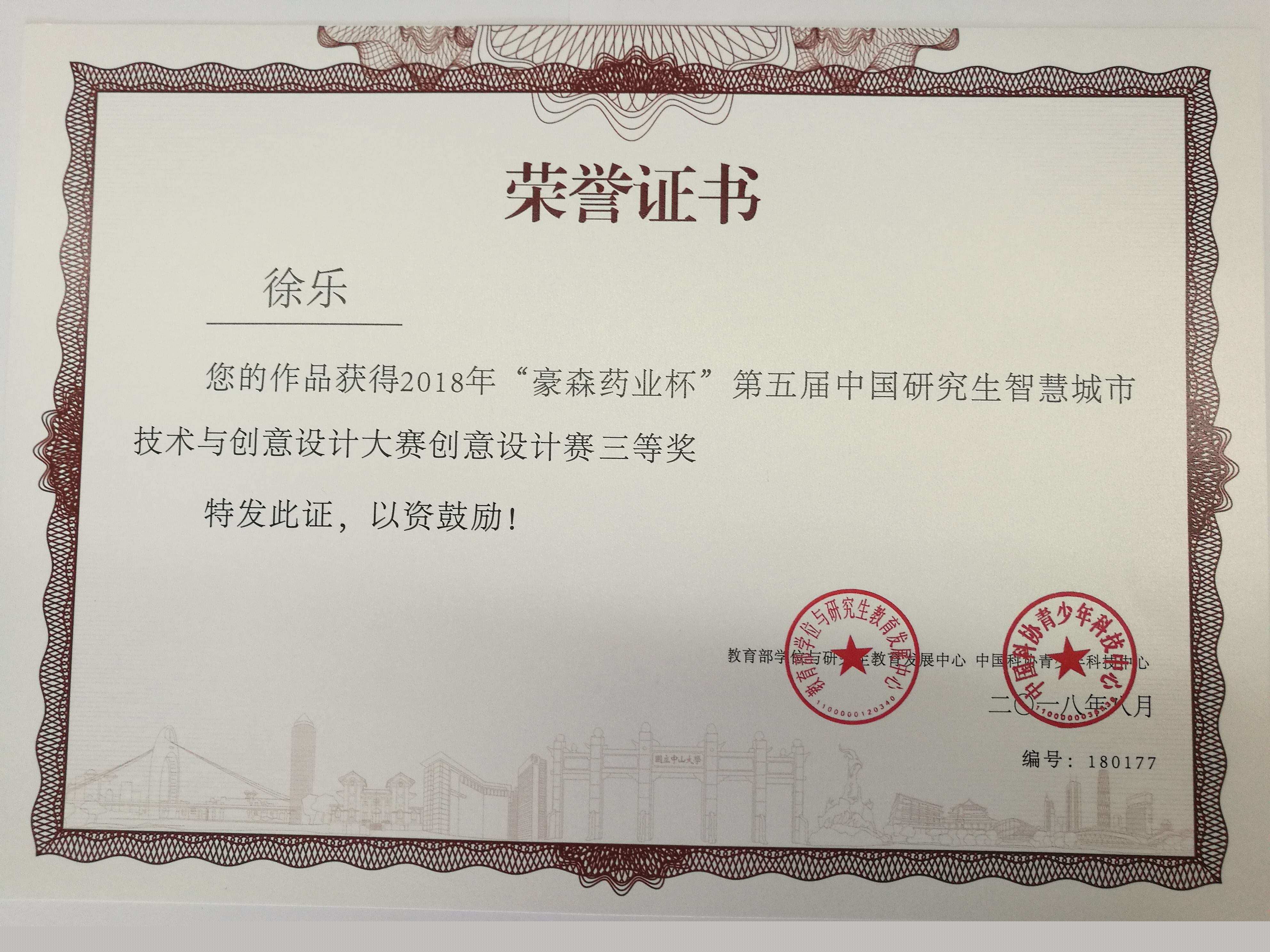 公司研究生在2018年“豪森药业杯”第五届中国研究生智慧城市技术与创意设计大赛创意设计赛中喜获全国三等奖!