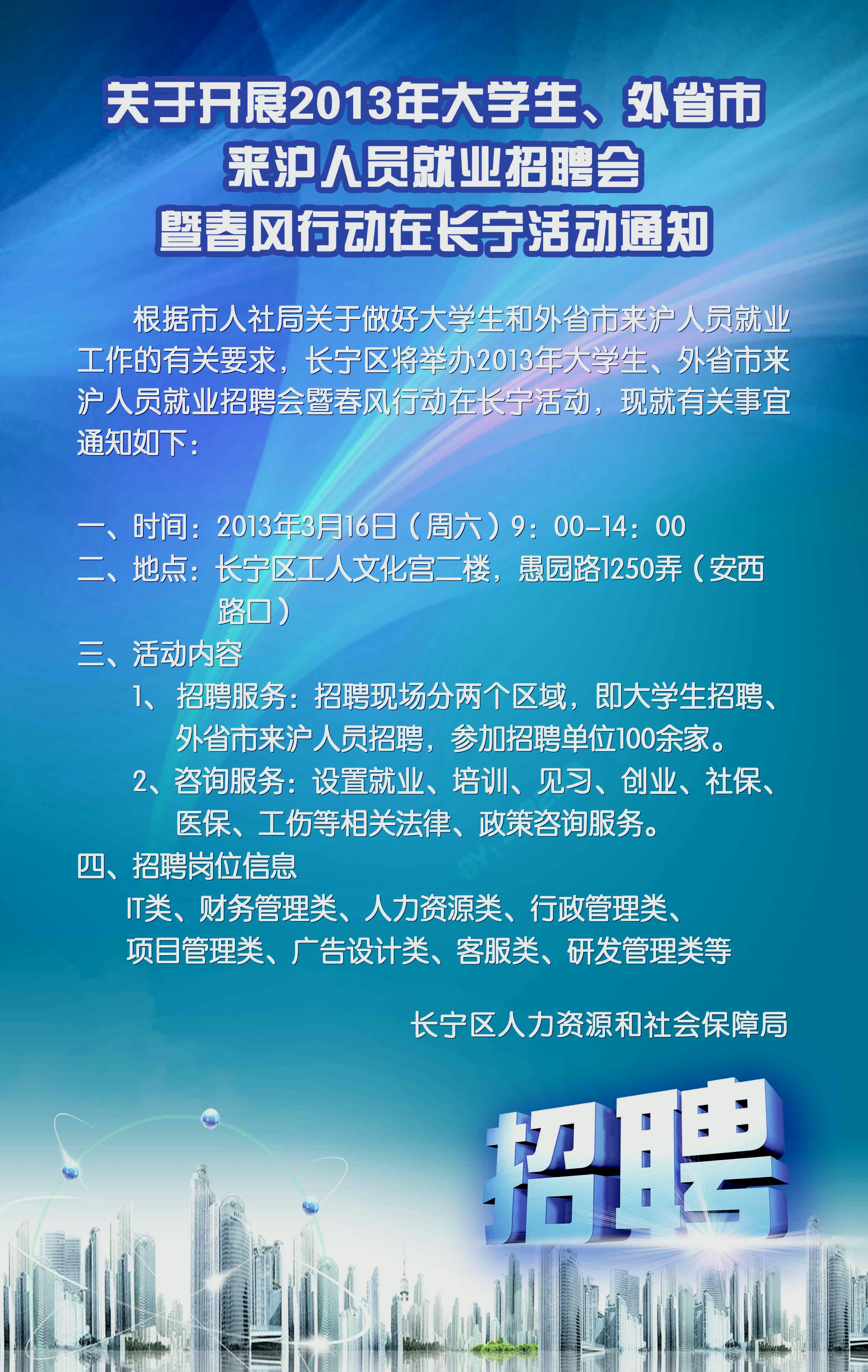 2013年老员工、外省市来沪人员就业招聘会将于2013年3月16日9:00—14:00,在长宁区工人文化宫二楼,愚园路1250弄(靠近安西路)召开,详见附件招聘海报,请还未落实工作的同学积极参加!