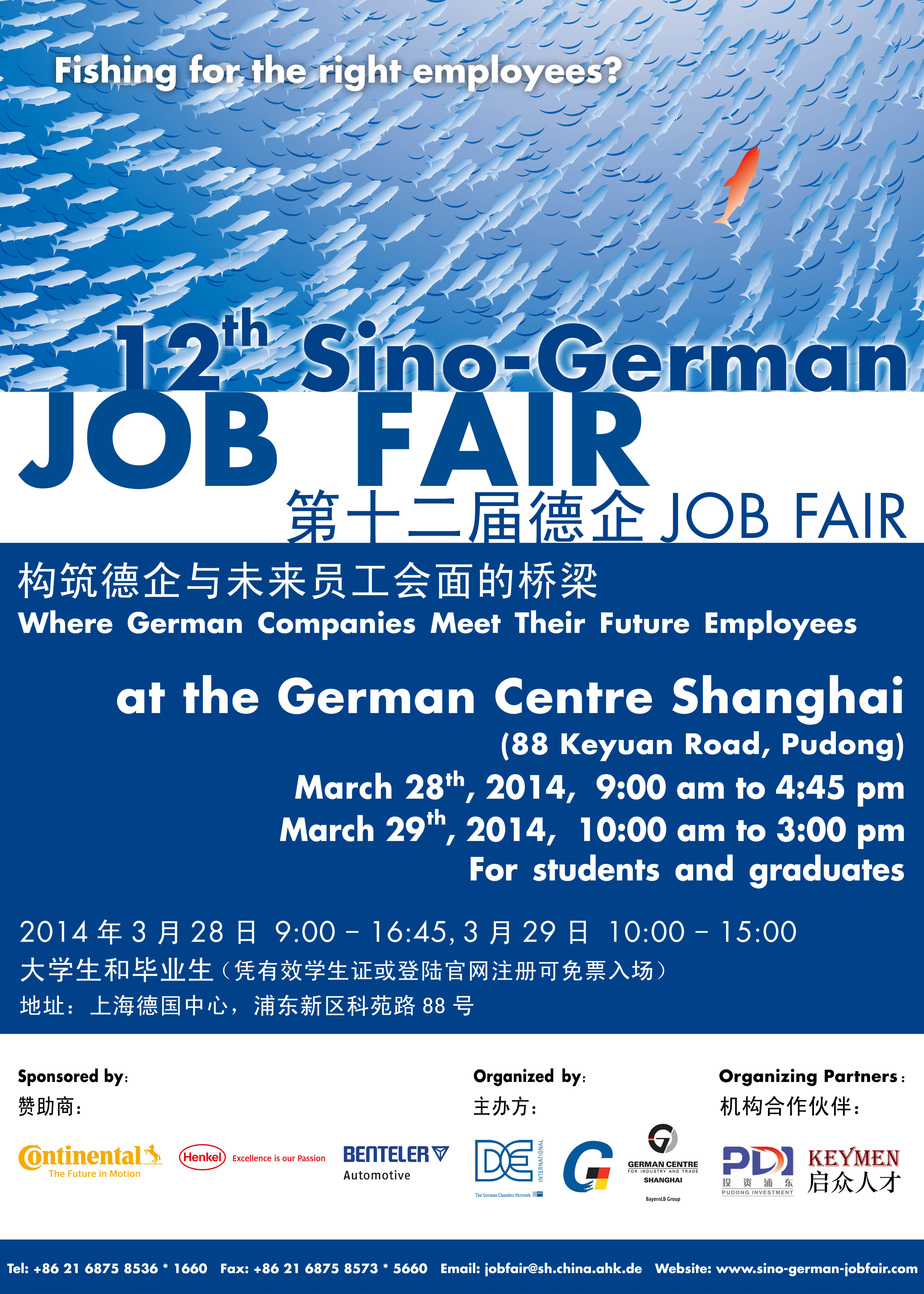 第十二届德企招聘会将于2014年3月28日和29日(星期五和星期六)在上海德国中心((上海市浦东新区科苑路88号,德国中心一号楼。地铁2号线张江高科站下步行15分钟即可到达)举行。员工可凭员工证免费参加.