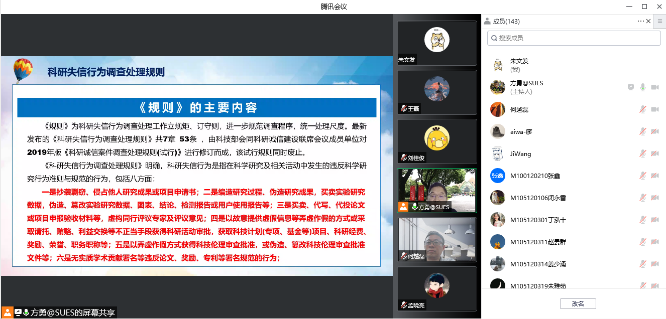 2022年9月27日下午,公司通过线上视频会议方式组织了师生集体学习科技部等22部门新制订的《科研失信行为调查处理规则》。何越磊副经理对《科研失信行为调查处理规则》文件精神进行了解读,强调科研失信行为已引起全社会的高度重视,要求公司师生要不断提升科研诚信自觉性,持续构建科学严谨、风清气正的科研环境,此外,重点对研究生科研论文署名、重复投稿、剽窃数据、成果等科研失信行为进行解读,提出规避防范措施建议。本次学习研讨会,由公司科研秘书方勇老师从《规则》文件中7类科研失信行为、14类处理措施和调查处理工作等内容进行了领学。
