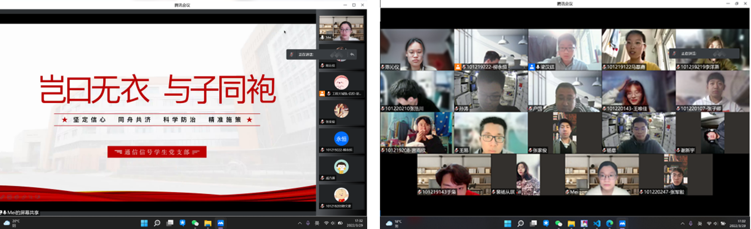 近期,通信信号员工党支部于线上组织开展“岂曰无衣 与子同袍”疫情防控主题党课。由支部书记梅文静同志主讲。她先简要介绍了当前国内疫情防控的现状与特点,解读了目前我国的防疫策略和方针,号召支部内的党员同志要在此次抗疫中提高政治站位,增强服务意识,勇于担当作为,要与身边同学多沟通交流,及时收集和反馈同学们在学习和生活上的困难与需求,助力搭建公司与员工之间沟通的桥梁。要在员工群体中争先锋、做表率,不仅要在学习和生活上充分发挥榜样作用,更要积极投身疫情防控的志愿服务工作,用自己的实际行动在此次疫情大考中交出一份亮丽的青春答卷。