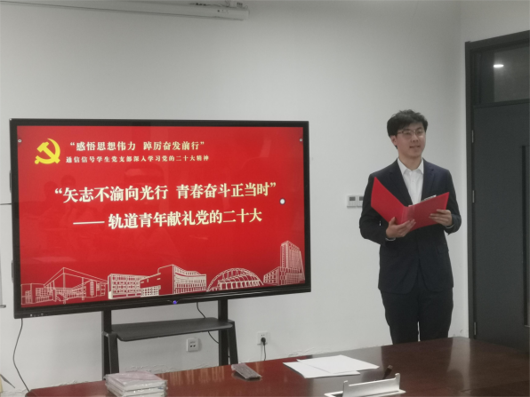 通信信号员工党支部党史宣讲团青年讲师杨展同志带来题为《矢志不渝向光行 奋斗青春正当时——轨道青年献礼党的二十大》的理论宣讲。他以中国铁路发展史为主线,讲述了中国共产党在百年光辉历程上团结带领中国人民矢志践行初心使命、筚路蓝缕奠基立业、创造辉煌开辟未来的故事,号召全体青年将党的二十大精神与生活实际紧密结合,为全面建设社会主义现代化国家、全面推进中华民族伟大复兴贡献青春力量。