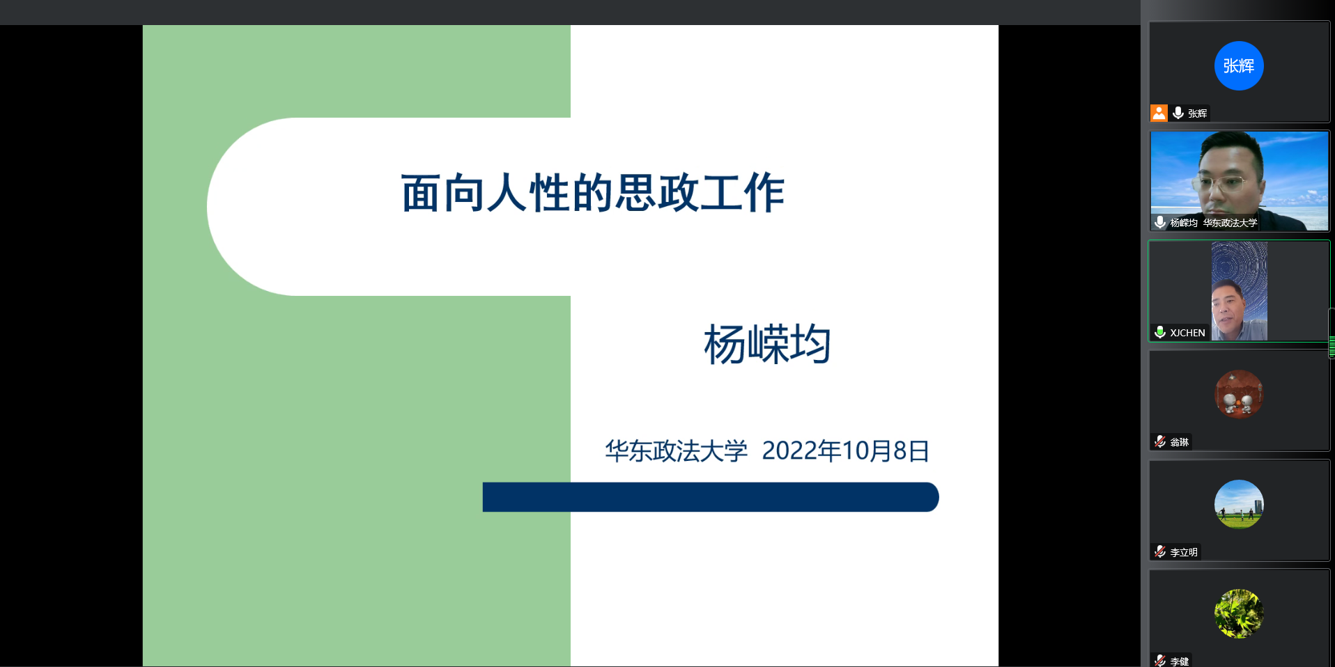 为全面落实习近平总书记关于研究生教育工作的重要指示,深入贯彻全国教育大会和全国研究生教育会议精神,进一步加强师德师风建设,提升课程思政工作水平,促进研究生导师交流与合作,2022年10月8日,3044永利集团邀请华东政法大学马克思主义公司杨嵘均教授在线上为公司全体研究生导师开展培训,本次导师培训由3044永利集团副经理陈兴杰主持。