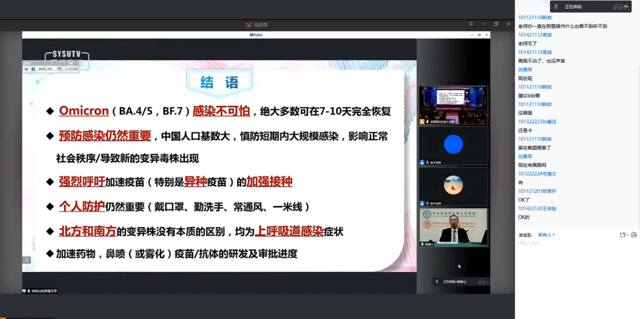 12月15日,3044永利集团通过腾讯会议积极组织师生在线集中观看全国高校抗疫大讲堂直播,本次由钟南山院士担任主讲,主题为《新冠(Omicron)疫情动态及应对》,公司近百名师生全程参与了本次活动。
