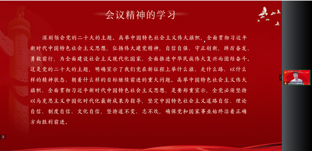 同时支部十位党员同志对比“八个明确”和“十个明确”的内容改变,对习近平新时代中国特色社会主义思想主体部分的“十个明确”录制了有声书,通过以原声诵原文,感受习近平新时代中国特色社会主义思想在理论层面上的新突破、新发展,让党的二十大精神绕于耳边,植于心田。
