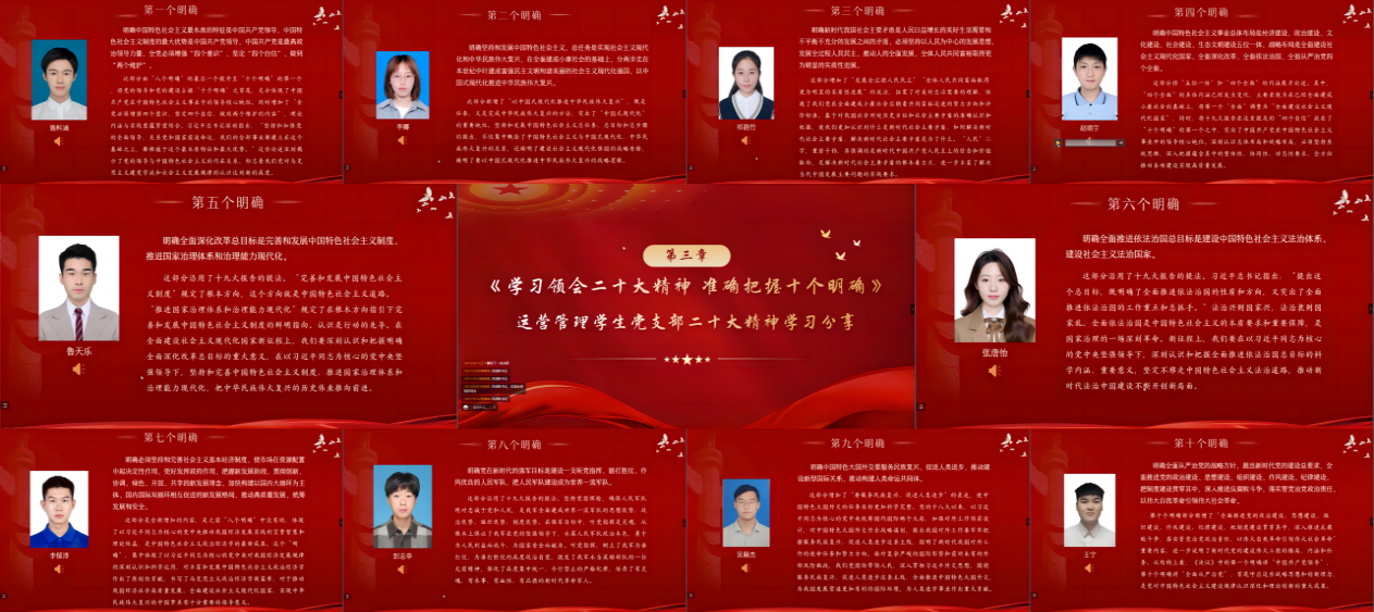 同时支部十位党员同志对比“八个明确”和“十个明确”的内容改变,对习近平新时代中国特色社会主义思想主体部分的“十个明确”录制了有声书,通过以原声诵原文,感受习近平新时代中国特色社会主义思想在理论层面上的新突破、新发展,让党的二十大精神绕于耳边,植于心田。
