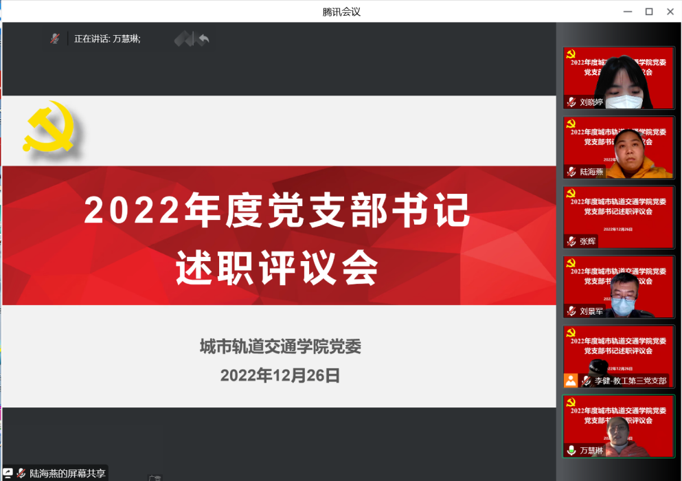 为深入学习贯彻党的二十大精神,认真落实公司党委相关部署要求,进一步推动党支部书记切实履行抓基层党建工作责任,提升支部书记队伍建设质量。12月26日下午,公司党委召开线上2022年度党支部书记述职评议会,公司党委书记万慧琳,党委副书记盛知恒,党委委员、工会主席李健出席会议,全体党支部书记,党支部委员及部分党员代表参加会议。会议由公司党委组织员陆海燕主持。