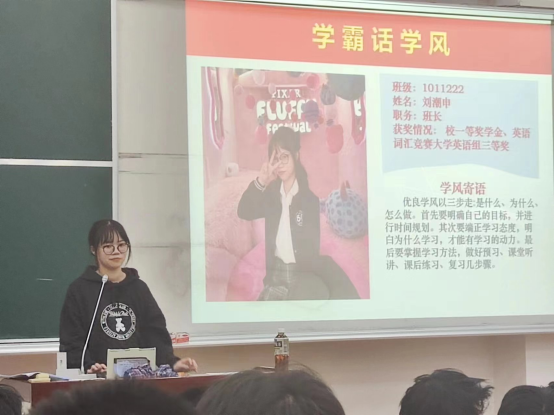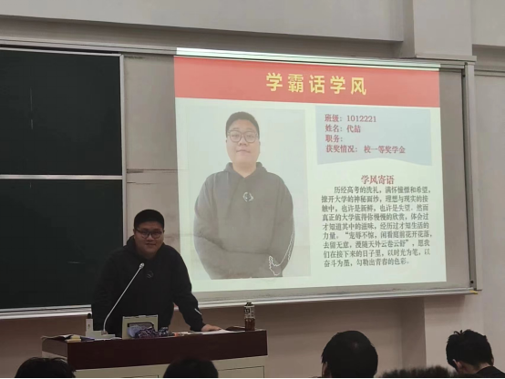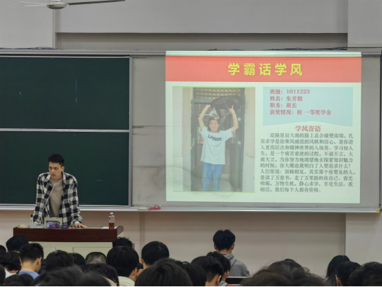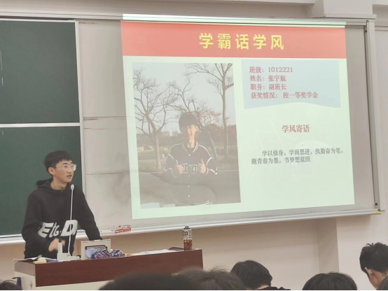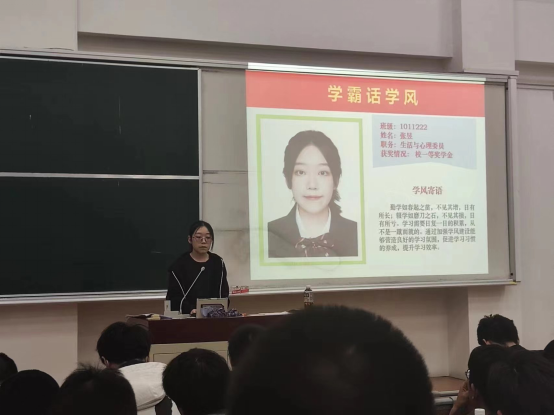 会上,邀请五位获得校一等奖学金的同学,开展了“学霸话学风”主题分享活动,同学们现场就学风问题交流自己的看法,分享了自己的学习经验和学风寄语。几位同学的分享准备充分、内容丰富,既有对学习的安排与规划,也有对日常生活的耐心讲解。会后,同学们均表示,通过本次主题班会和“学霸话学风”主题分享活动,对同学们明确学习目标、端正学习态度、激发学习动力,形成严于律己、自强不息、拓展视野、勤于实践、建设优良班风学风都具有积极意义。