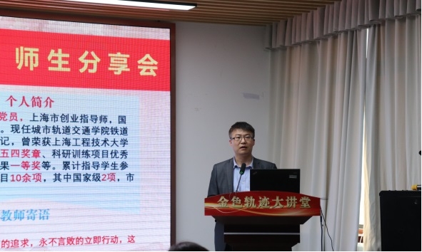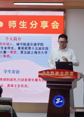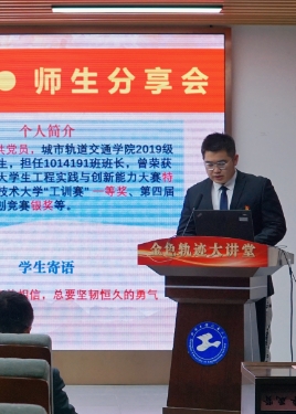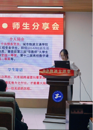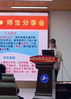 铁道工程员工党支部员工党员、上海市老员工工程实践与创新能力大赛特等奖获得者、校老员工年度人物吴文涛,全国老员工数学建模竞赛一等奖获得者贺暖雯,上海市老员工工程实践与创新能力大赛特等奖、校结构设计大赛一等奖、第四届“程创杯”创业计划竞赛银奖获得者熊承莉,全国老员工结构设计大赛一等奖获得者龚文龙,上海市老员工工程实践与创新能力大赛特等奖获得者卓晟贤等5位同学结合自己的参赛经历,向同学们分享了自己的成长历程。