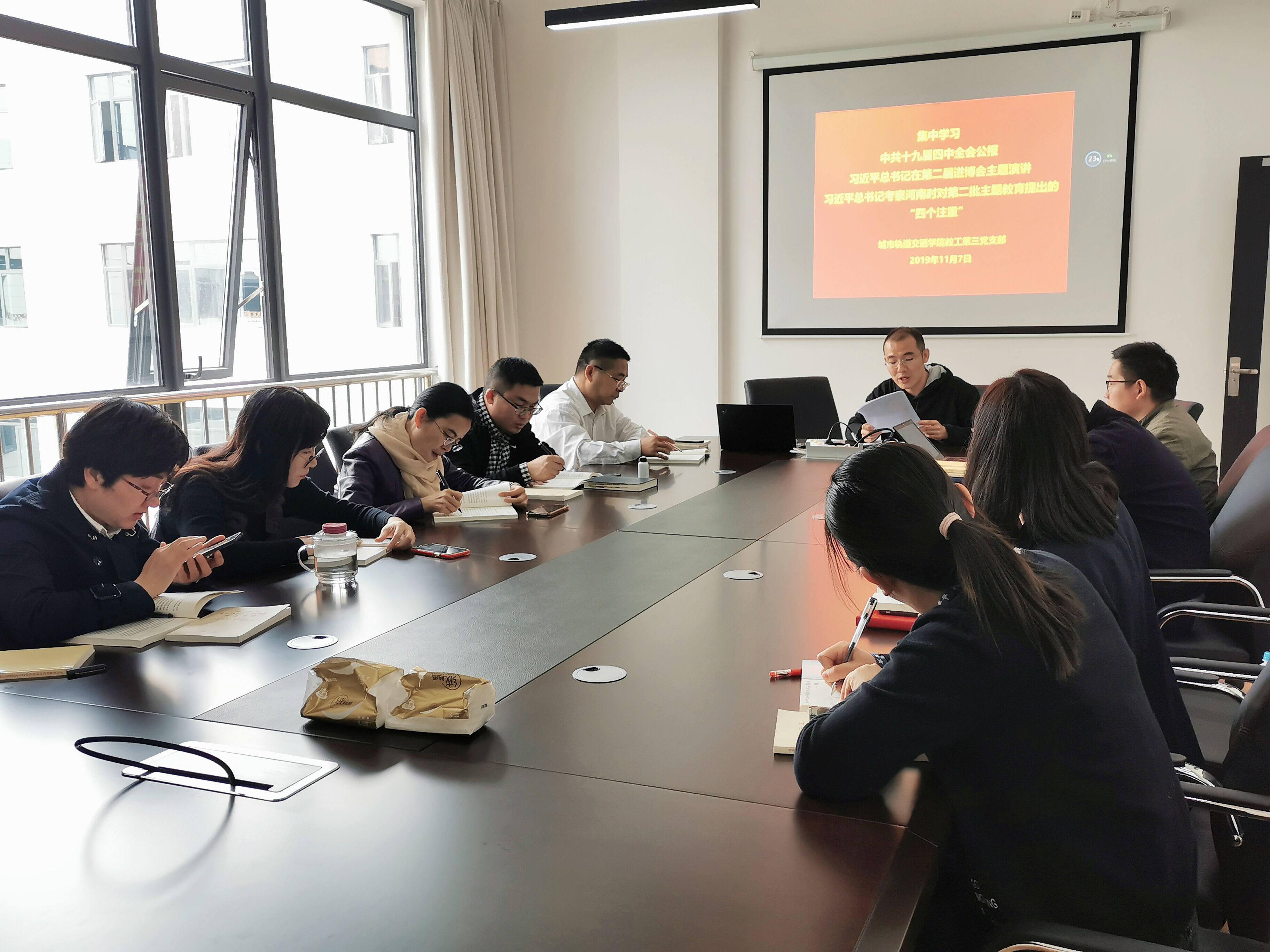 11月7日中午,3044永利集团教工第三党支部在公司8A534会议室举行党员大会集中学习中共十九届四中全会公报、习近平总书记在中国第二届进博会上的主旨演讲、习近平总书记在9月16日至18日考察河南时对第二批主题教育提出的“四个注重”等三份文件材料的集中学习,由支部书记主持。