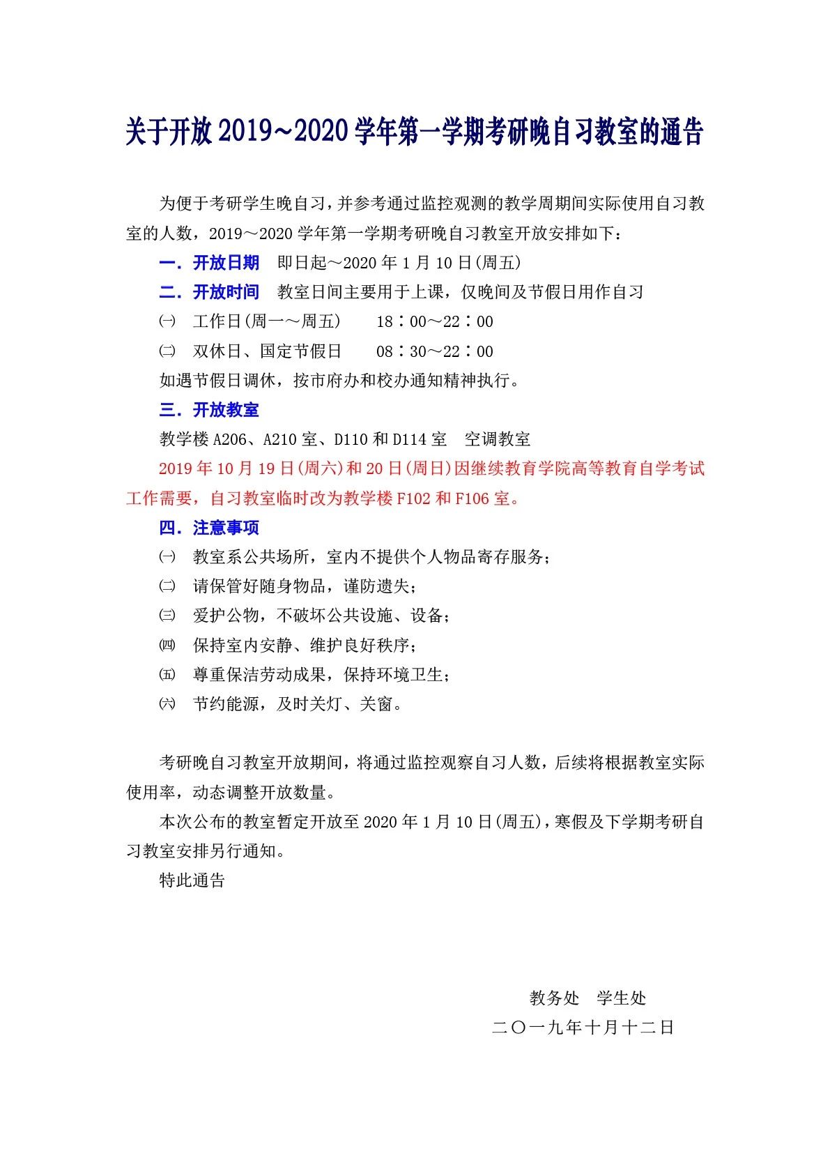 关于开放2019~2020学年第一学期考研晚自习教室的通告