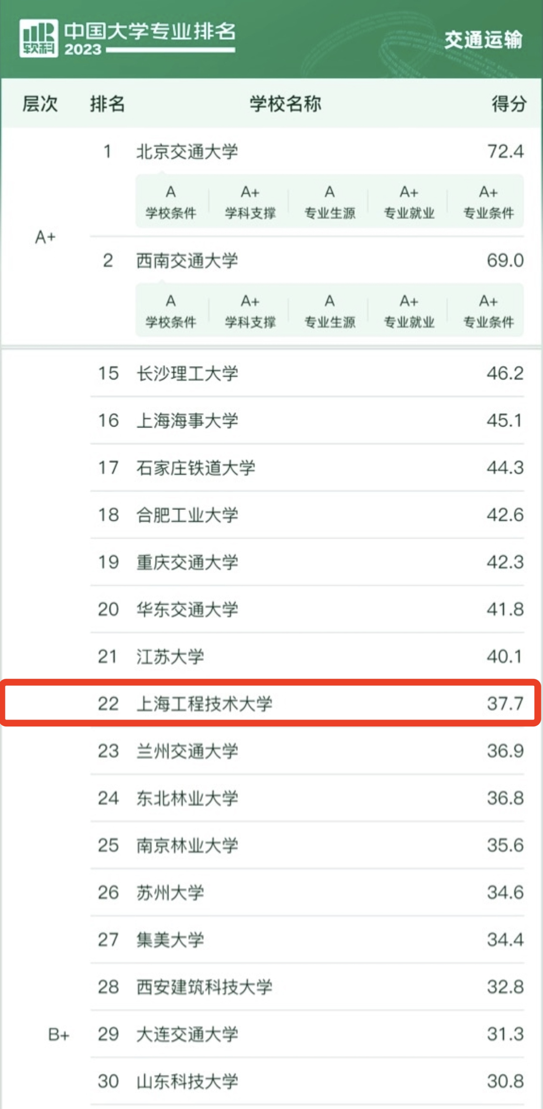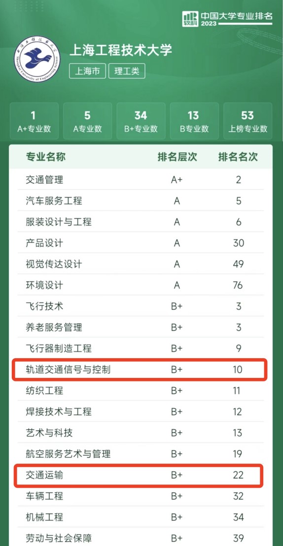 On June 15, in the "2023 Soft Science Chinese University Professional Ranking" officially released by the higher education professional evaluation institution Soft Science, Shanghai University of Engineering Science was ranked 22nd in the field of transportation, an increase of 2 places from last year's ranking. The ranking of undergraduate majors in Chinese universities in the field of soft science is currently the largest in terms of the number of majors covered and the scale of participating majors.