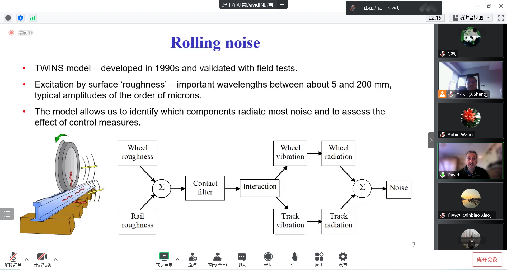 会上,David Thompson教授指出在许多情况下,轮轨滚动噪声是列车运行中的主导噪声源。虽然在高速条件下气动噪声变得重要,但轮轨滚动噪声的贡献依旧是不可忽视的。要有效控制噪声,必须知道各种声源的贡献,并针对主导声源采取措施。预测模型在识别声源贡献量和指导噪声控制措施的选择上是非常有用的。David Thompson教授介绍了控制滚动噪声的各种措施,如钢轨阻尼器、钢轨扣件、车轮设计、车轮阻尼器、局部遮挡和粗糙度控制等,并讨论它们潜在的效果以及应用到高速铁路的实践困难。David Thompson教授丰富的学识、解决科学问题的独特思路,令在座师生大受启发。