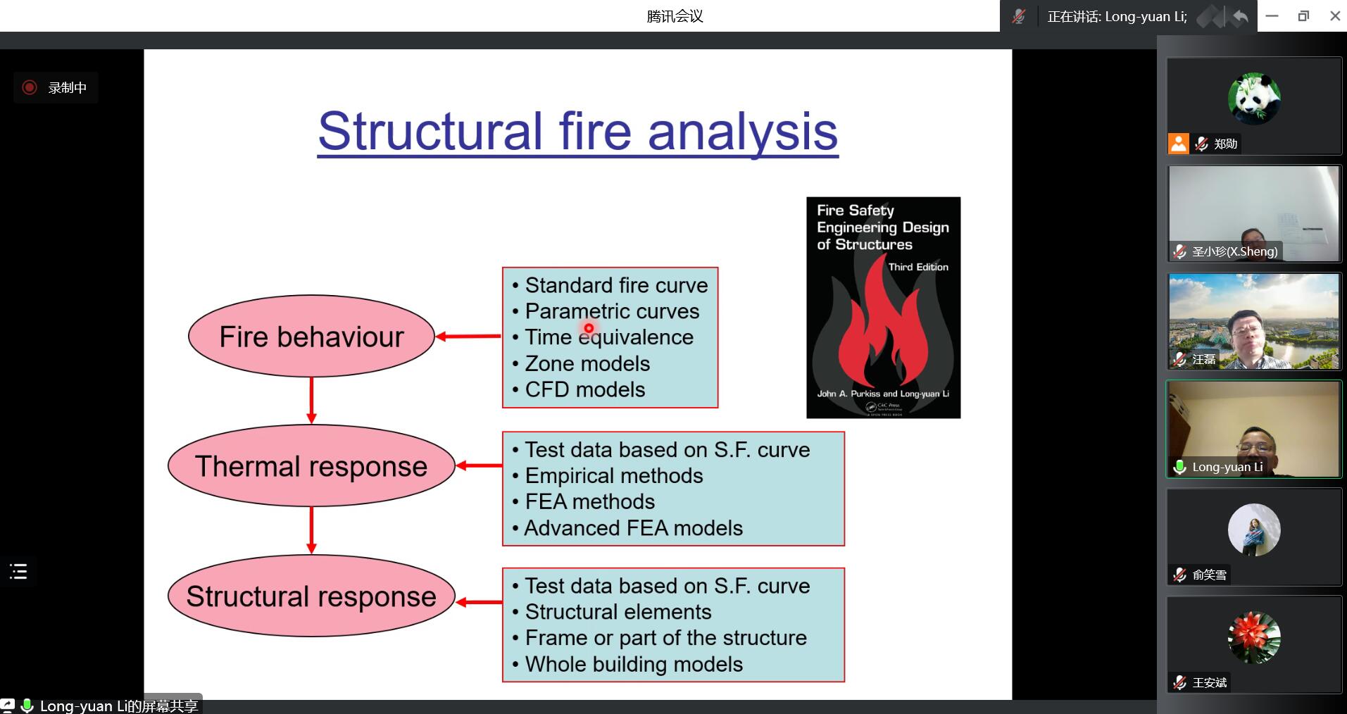 会上,李龙元教授就混凝土结构的火灾分析的主题进行了讲座。消防安全是现代结构设计中的一个重要问题,特别是高层建筑和地下交通运输隧道。混凝土在高温下的力学行为和破坏机理与环境温度下的力学行为和破坏机理有显著差异。李教授介绍了混凝土在高温下的力学性能、混凝土在火灾中的分析、混凝土在机械和热荷载作用下的破坏机理,以及混凝土结构的设计以提高其防火安全性。李教授丰富的学识、解决科学问题的独特思路,令在座师生大受启发。